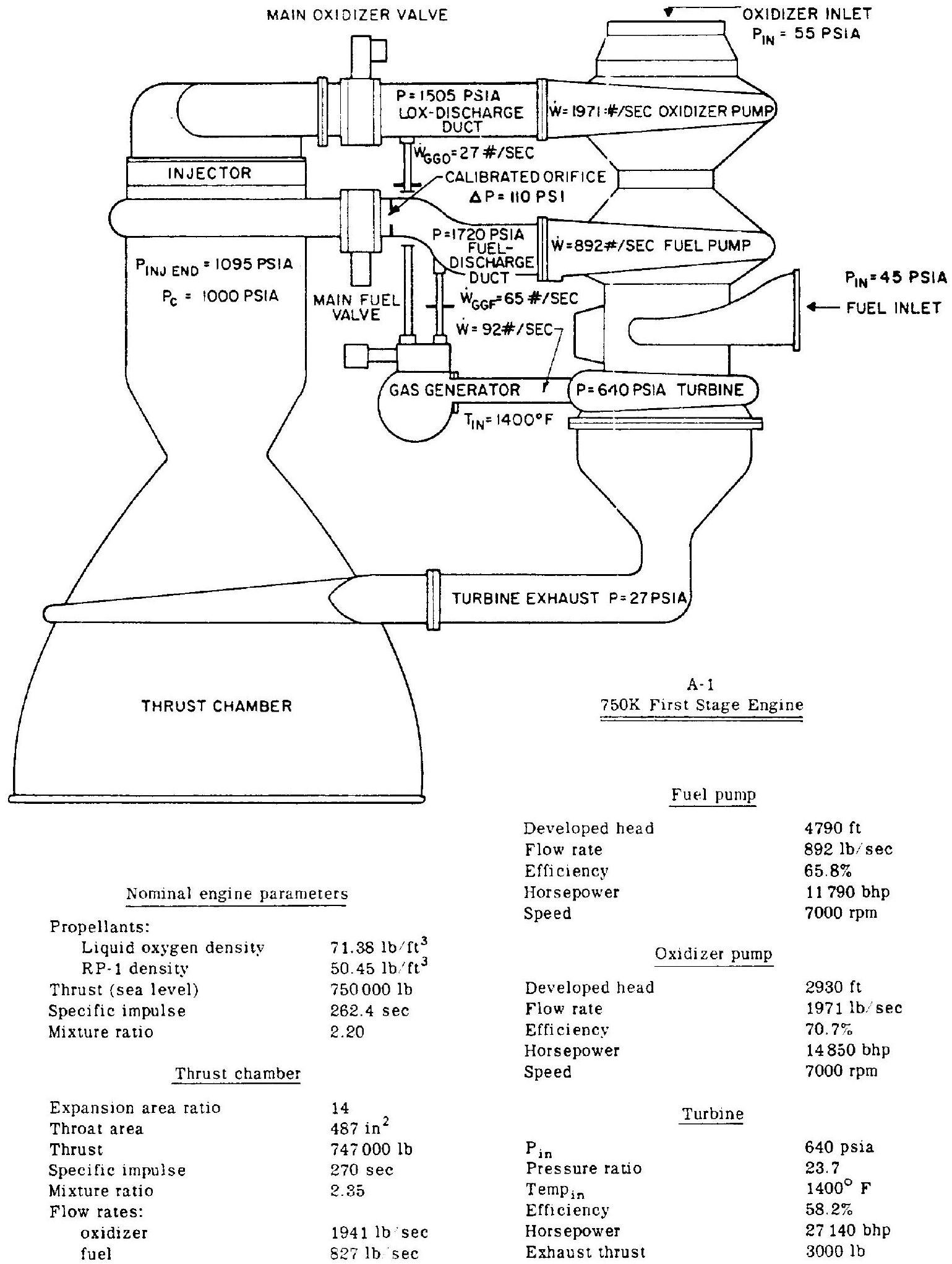 Table 3-2.-750K A-1 Stage Engine Operating Parameters [Sea-level conditions] Engine (turbopump feed): Line pressure drop psi ..... 10 Thrust ..... lb . . . . . . . 750000 Nominal single-firing duration ..... sec. . . . . . . . . 165 Specific impulse sec. . . . . . . 262.4 Oxidizer LO2\mathrm{LO}_{2} : Flow rate ..... lb/sec . . . . 1967.7 Density lb/ft371.38\mathrm{lb} / \mathrm{ft}^{3} \ldots \ldots 71.38 Fuel RP-1: Flow rate ..... lb/sec . . . . 892.3 Density. lb/ft3\mathrm{lb} / \mathrm{ft}^{3} ..... 50.45 Mixture ratio O/F ..... 2.20 Thrust chamber (tubular wall construction regeneratively cooled by fuel): Thrust ..... lb . . . . . . . 747000 Specific impulse ..... sec. . . . . . . . . 270 Injector end pressure psia ..... 1095 Nozzle stagnation pressure psia ..... 1000 Oxidizer flow rate lb/sec\mathrm{lb} / \mathrm{sec} ..... 1941 Fuel flow rate. lb/sec ..... 827 Mixture ratio O/F ..... 2.35 cc^{*} efficiency Percent ..... 97.5 cc^{*} ft/sec\mathrm{ft} / \mathrm{sec} ..... 5660 CtC_{t} efficiency Percent ..... 98 C1C_{1} ..... 1.532 Contraction ratio Ac/AtA_{c} / A_{t} ..... 1.6 Expansion ratio Ae/AtA_{e} / A_{t} ..... 14 Throat area AtA_{t} in 2{ }^{2} ..... 487 L* . in ..... 45 Nozzle contour ..... 80 percent bell Oxidizer side: Injector pressure drop psi ..... 200 Torus dome pressure drop psi ..... 150 Line pressure drop psi ..... 25 Main valve pressure drop psi ..... 35 Pump inlet pressure psia ..... 55 Pump discharge pressure psia ..... 1505 Developed pump head ft ..... 2930 Pump: Flow rate lb/sec ..... 1971 Shaft power bhp ..... 14850 Efficiency Percent ..... 70.7 Shaft speed rpm. ..... 7000 Heat exchanger lb/sec\mathrm{lb} / \mathrm{sec} ..... 3 Fuel side: Injector pressure drop psi ..... 200 Jacket and manifold pressure drop psi ..... 290 Main valve pressure ..... psi ..... 15 Calibration orifice pressure drop psi ..... 110 Pump: Inlet pressure psia ..... 45 Discharge pressure. psia ..... 1720 Developed pump head ..... 4790 Pump: Flow rate ..... lb/sec ..... 892 Shaft power bhp ..... 11790 Efficiency Percent ..... 65.8 Shaft speed rpm ..... 7000 Turbine: Inlet pressure psia ..... 640 Inlet temperature ..... 1400 Pressure ratio ..... 23.7 Gas flow rate lb/sec\mathrm{lb} / \mathrm{sec} ..... 92 Shaft power ..... bhp. . . . . . . 27140 Efficiency Percent ..... 58.2 Shaft speed rpm. ..... 7000 Shaft torque in-lb ..... 20380 Auxiliary drive: Shaft power bhp. ..... 500 Gas generator system: Oxidizer side: Flow rate lb/sec ..... 26.7 Entrance loss psi ..... 25 Line pressure drop psi ..... 25 Control-orifice pressure drop psi ..... 615 Valve pressure drop psi ..... 10 Injector pressure drop psi ..... 120 Fuel side: Flow rate lb/sec\mathrm{lb} / \mathrm{sec} ..... 65.3 Entrance loss psi ..... 25 Line pressure drop psi ..... 25 Control-orifice pressure drop psi ..... 800 Valve pressure drop psi ..... 20 Injector pressure drop psi ..... 140 Gas generator: Mixture ratio ..... O/F ..... 0.408 Injector end pressure psia ..... 710 Combustor pressure drop psi ..... 70 Thrust vector control: Minimum acceleration rad/sec2\mathrm{rad} / \mathrm{sec}^{2} ..... 1 Maximum velocity deg // sec ..... 10 Displacement deg. ..... ±14\pm 14