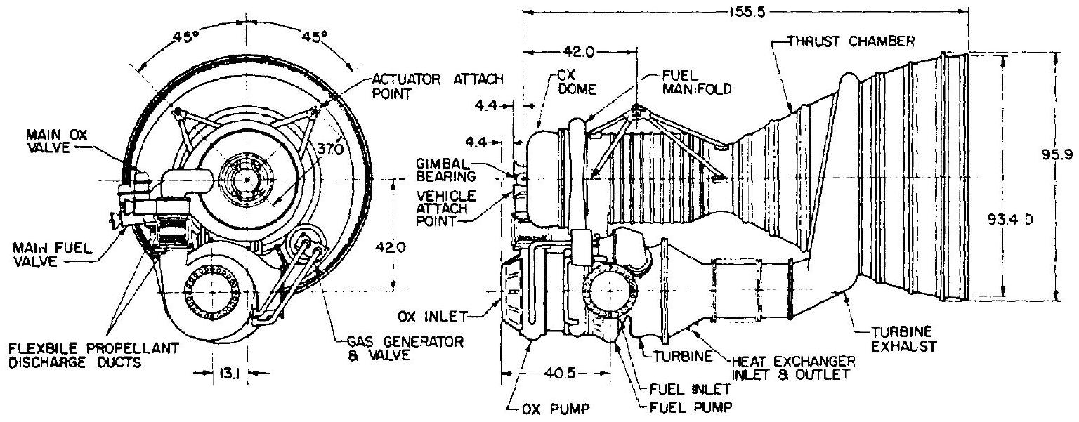 For simplicity of mounting and compactness, the turbopump is attached directly to the thrust chamber. All other components are either mounted on these two assemblies, or are located in the plumbing system between them. This arrangement permits engine gimbaling without pumpdischarge high-pressure propellant-duct flexure. Rather, thrust-vector control is achieved by gimbaling the entire engine. The engine weighs approximately 7500 pounds dry, 7900 pounds wet, and 7830 pounds at burnout. The preliminary design layout of the A-1 engine system and its overall dimensions are shown in figure 3-2.