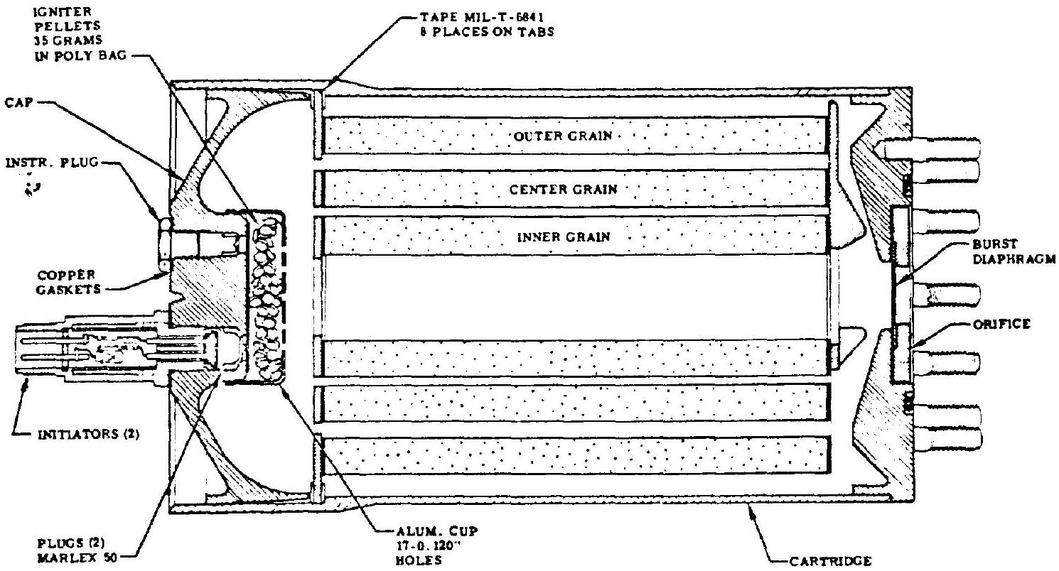 Twenty milliseconds after start, the solid grain produces a gas-flow rate of approximately 4.68 pounds per second. It will maintain this flow rate for approximately 1.0 second. This gas generator operates at and at a chamber pressure of 1000 psia . The product gas renders an approximate characteristic velocity of . A burst diaphragm located just upstream of the gas generator orifice is used to seal the unit during storage. It is ruptured by the increased gas pressure at start. Body and end cap are made of 4130 steel.
