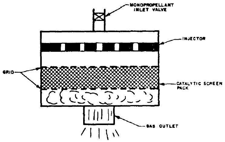 Figure 4-50 shows the schematic of a typical monopropellant gas generator using 90 percent hydrogen peroxide. The catalytic screen pack or bed consists of alternate layers of stainlesssteel mesh and silver-plated brass wire screens secured by perforated end plates or grids, which are applied with a preload of approximately 1000 pounds per square inch of bed crosssectional area. The length of the catalytic bed generally ranges from 2 to 3 inches. The allowable design throughput, that is, propellant flow rate per unit cross-sectional area of catalytic bed, is about . The propellant pressure drop across the bed can be approximated by