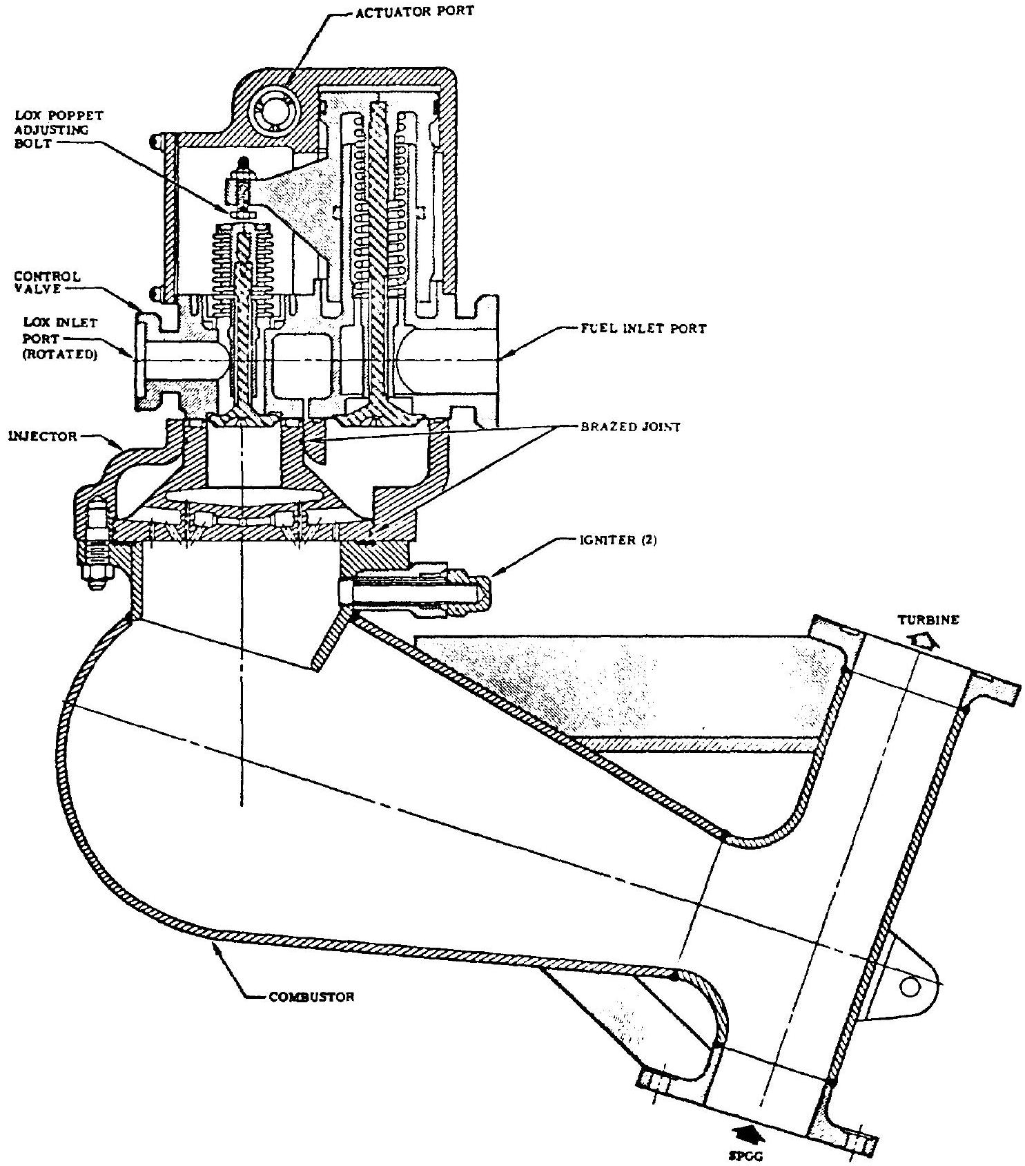 Figure 4-51 and table 4-2 describe a typical liquid bipropellant gas generator system. It is designed to produce hot gases using primary engine propellants ( ) for driving the turbine of a pump-fed system. The control system consists of two normally closed, linked poppet valves that control the flow of propellants to the gas generator injector. The valve assembly includes an oxidizer strainer, oxidizer poppet, fuel poppet, timing orifice, actuating piston, and valve main body. The valve assembly is actuated by gas pressure which forces the piston on the fuel side down to open the fuel poppet. A yoke integral with the piston actuates the oxidizer poppet. The valve design, through a combination of manifold volumes and LOX poppet adjustment, effects a slight oxidizer lead to prevent detonations, and a fuel-rich cutoff to eliminate the possibility of turbine burning. The propellants flow through the poppets to the injector and into the gas generator combustor, are mixed, and burn within the inner chamber and combustor body. Ignition of the propellants is accomplished by two pyrotechnic igniters. A gas duct with two flanges opposite to each other is located at the end of the combustor body. These flanges connect with the solid propellant gas generator turbine spinner and the turbine inlet.