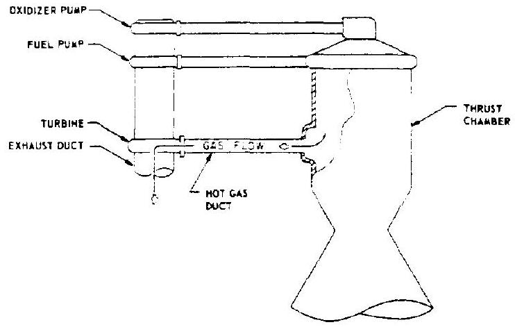 With these systems, combustion product gases are bled from the main thrust chamber and ducted to the turbine, where they are used as the working fluid. This arrangement eliminates the need for a separate gas generator system and contributes significantly to the simplicity and its reliability potential of the engine system. The technique has been successfully developed by North American Aviation's Rocketdyne Division and appears to be particularly promising for hydrogen engines requiring throttling. Figure shows a schematic of a tapoff system.