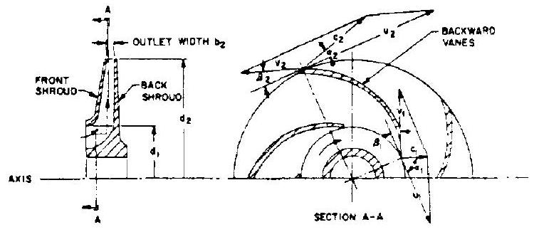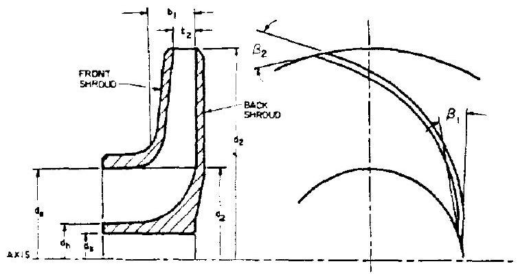 Figure 6-37 presents the basic layout of a typical radial-flow impeller with backward curved vanes.The shaft diameter ds may be determined by the following correlations