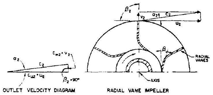 For pumping low-density propellants (such as liquid hydrogen), which is associated with very high developed heads, straight radial vanes are frequently used in centrifugal impellers, since they permit a higher obtainable head coefficient ψ. Figure 6-36 presents a typical radial vane impeller and its outlet velocity diagram. The vane discharge β2=90∘ and cy2=u2. The ideal developed head of a radial vane impeller becomes