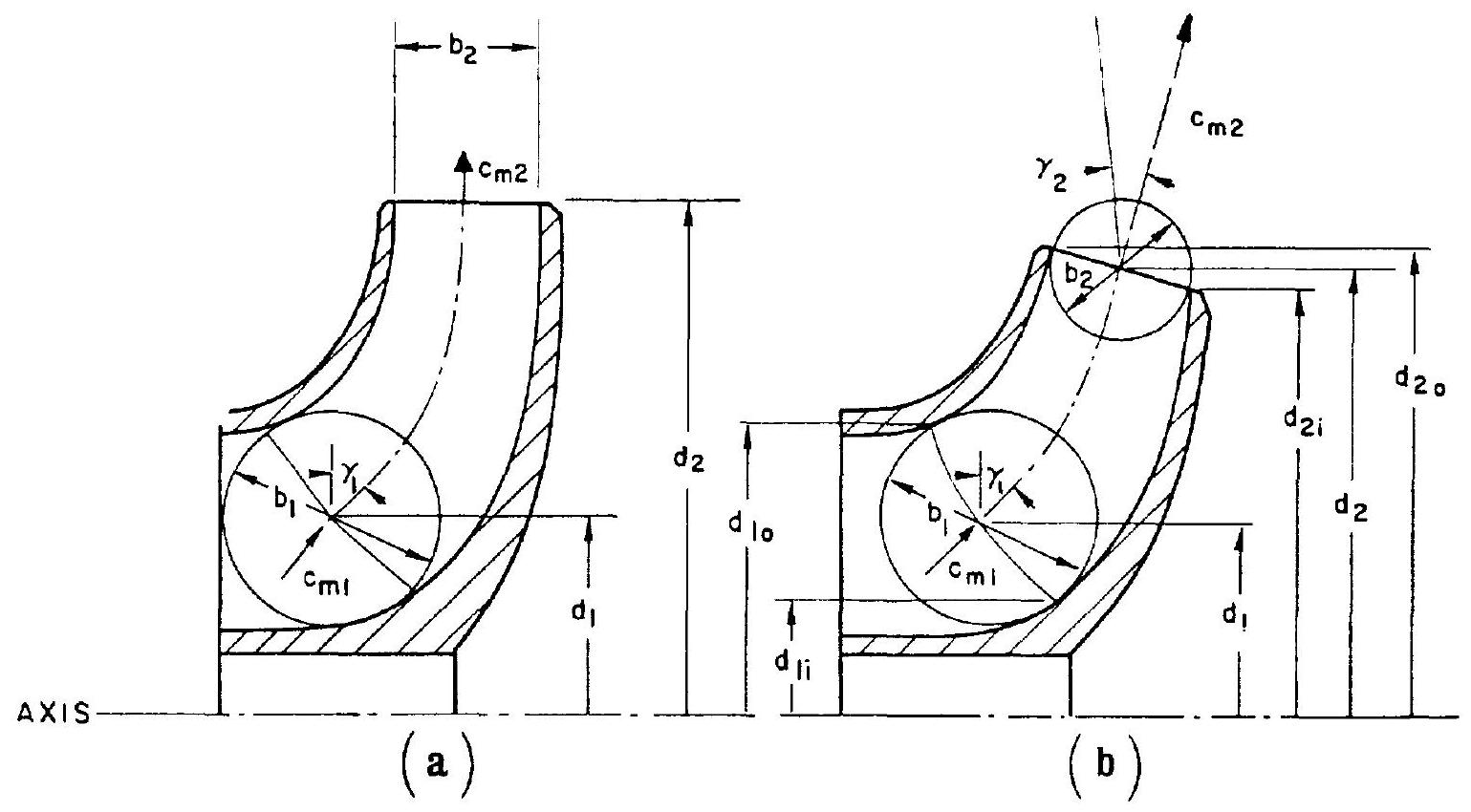 Effective impeller widths at inlet and discharge, b1 and b2, are also presented in figure 6-38 a and b. They are equal to the diameter of a circle which is tangent to the contours of both front and back shrouds. γ is the angle between the meridional flow vectors ( cm1 and cm2 ) and the plane normal to the axis of rotation. It is also the angle between the plane of the velocity