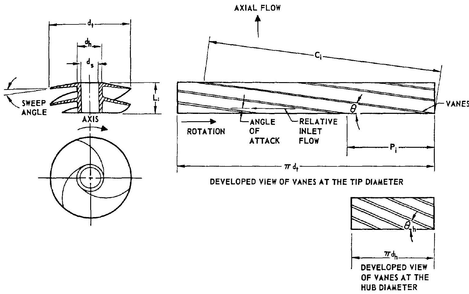 Mixed-flow-type vanes which extend into the impeller entrance or eye (shown in fig. 6-38a) are frequently used in radial-flow impellers or centrifugal pumps. This is done to match the impeller inlet flow path with the inducer discharge flow pattern and to provide more efficient turning of the flow.