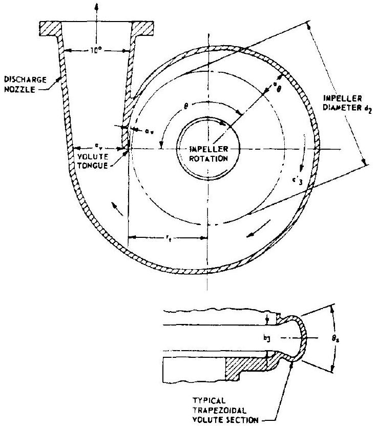 The hydraulic characteristics of a plain volute are determined by several design parameters which include: volute throat area av and flow areas aθ, included angle θs between volute side walls (fig. 6-44), volute tongue angle αV, radius rt at which the volute tongue starts, and volute width b3. Their design values are somewhat influenced by the pump specific speed NS and are established experimentally for best performance.