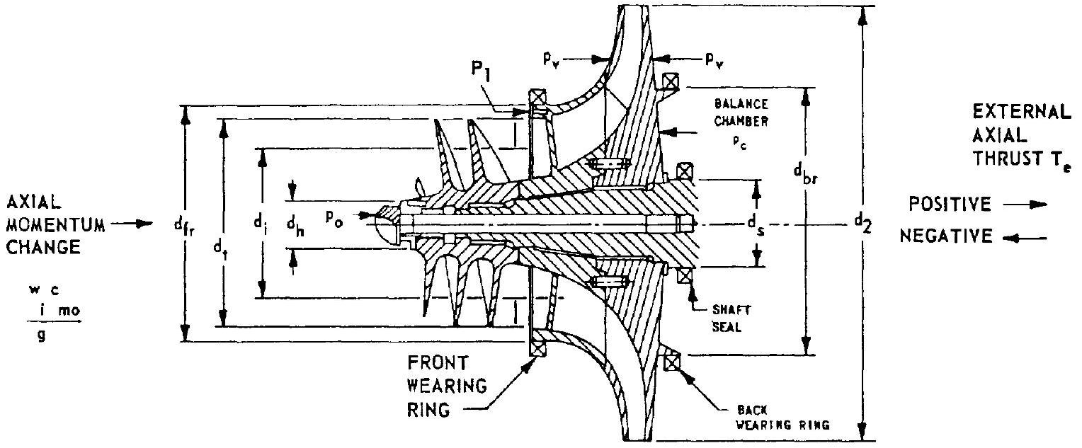 With the first method (as shown in fig. 6-47), a balance chamber is provided at the back shroud of the impeller, between back wearing ring diameter dbr and shaft seal diameter ds. Balancing of axial loads is effected by proper selection of the projected chamber area and of the admitted fluid pressure. The pressure level pc in a balance chamber can be controlled by careful adjustment of the clearances and leakages of the back wearing ring and the shaft seals. The required pc may be determined by the following correlation:
