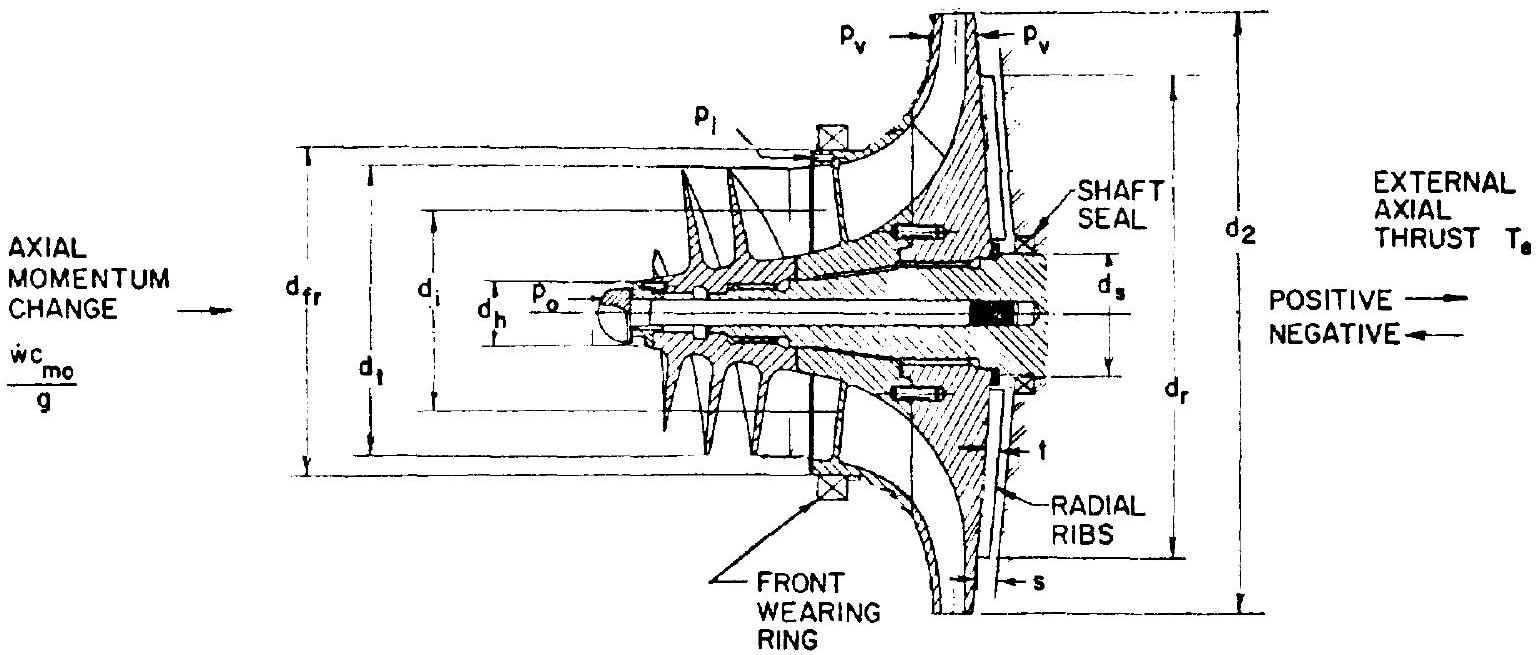 In the second method (as shown in fig. 6-48), straight radial ribs are provided at the back shroud of the impeller to reduce the static pressure between the impeller back shroud and casing wall through partial conversion into kinetic energy. This reduction of axial forces acting on the back shroud of the impeller may be approximated by the following correlation: