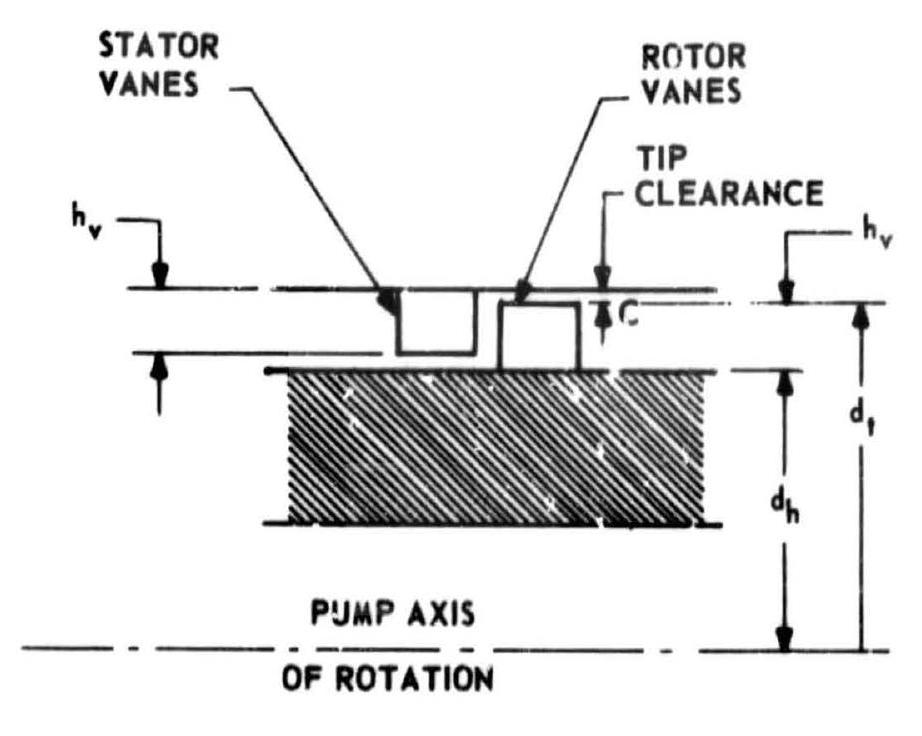 The capacity of an axial-flow hydrogen pump is usually limited to about 5500 gpm as a minimum. This is due to the mininum practical height hV of the vanes (fig. 6-49). For heights below 0.5 inch, the tip clearance required for efficient performance becomes critical, causing manufacturing problems. A reduction in rotor diameter below certain values is not practical either, because of the high rpm required for proper blade speec.
