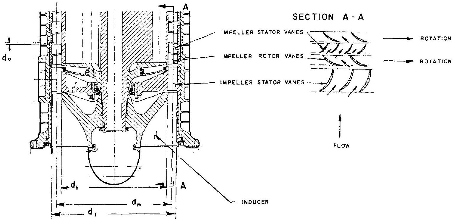 Except when used as inducers, application of axial-flow pumps in rocket engines is essentially limited to liquid hydrogen systems in a multistage configuration. Thus, the following discussions are applicable to axial-fiow hydrogen pumps only. Multistage axial-fow hydrogen pumps are applied in regions which are beyoad the capability of a single-stage centrifugal pump, since their construction is comparatively simple (fig. 6-4). As can be seen in figure 6-6, the fluid in an axial-flow pump flows from one stage to the next with a minimum of connecting passages.