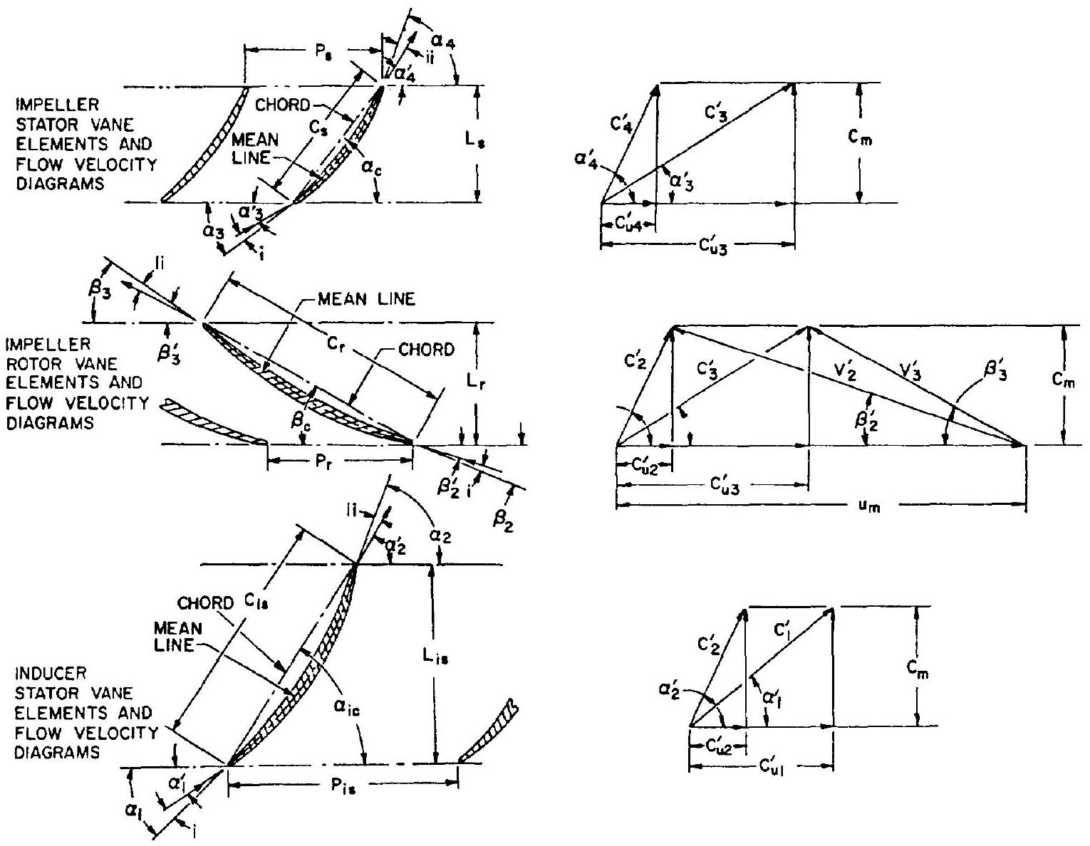 Pis = pitch or inducer stator vane spac- ing, in zis = number of inducer stator vanes Sis = inducer stator vane solidity Cis = inducer stator vane chord length, in aic= chord angle of the inducer stator vane, deg a1,a2= vane angles at inducer stator inlet and outlet, deg. Ris = radius of the inducer stator vane curvature, in Lis = axial length of the inducer stator vane, in i = angle of attack, deg ii = angle allowed for circulatory flow at the outlet, deg a1′,a2′= absolute flow angles at inducer stator inlet and outlet, deg cm= axial component of the absolute flow velocity, ft/secc1′,c2′= design absolute flow velocities at inducer stator inlet and outlet, ft/sec c1u′,c2u′= tangential components of the design absolute velocities at inducer stator inlet and outlet, ft/sec a1t,a1h= inducer stator inlet vane angles at tip and hub diameters, deg a2t,a2h= inducer stator outlet vane angles at tip and hub diameters, deg a1X,a2X= vane angles at any diameter dX (All parameters refer to the mean effective diam- eter dm, unless specified differently.)