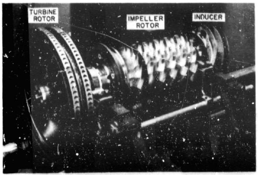 Figure 6-53.-Inducer, impeller rotor, and turbine rotor assembly of a typical multi-stage axialflow pump.