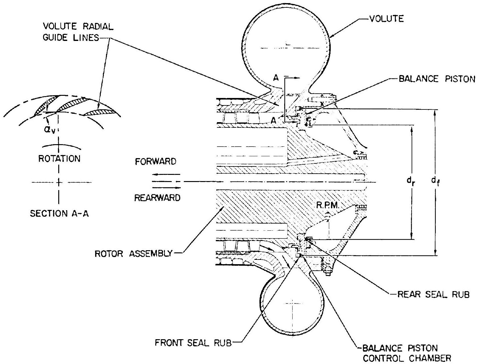 shown in figure 6-54. It consists of a disk having small clearances with a pair of seal rubs. located on either side of the disk. A forward movement (toward the inlet) of the rotor assembly, and thus the balance piston, reduces the clearance at the front seal rub, simultaneously increasing it at the rear seal rub. As a result, the pressure in the control chamber between front and rear seal rubs is reduced. This effect counteracts the forward hydraulic axial thrust of the rotor assembly and restrains its forward motion. Similarly, a rearward movement (reverse thrust) of the rotor assembly is counteracted by a pressure increase in the control chambers. The volume to the rear of the control chamber, through cavities in the rotor, communicates with the lowpressure region of the pump inlet. The variation in forward axial thrust can be expressed as