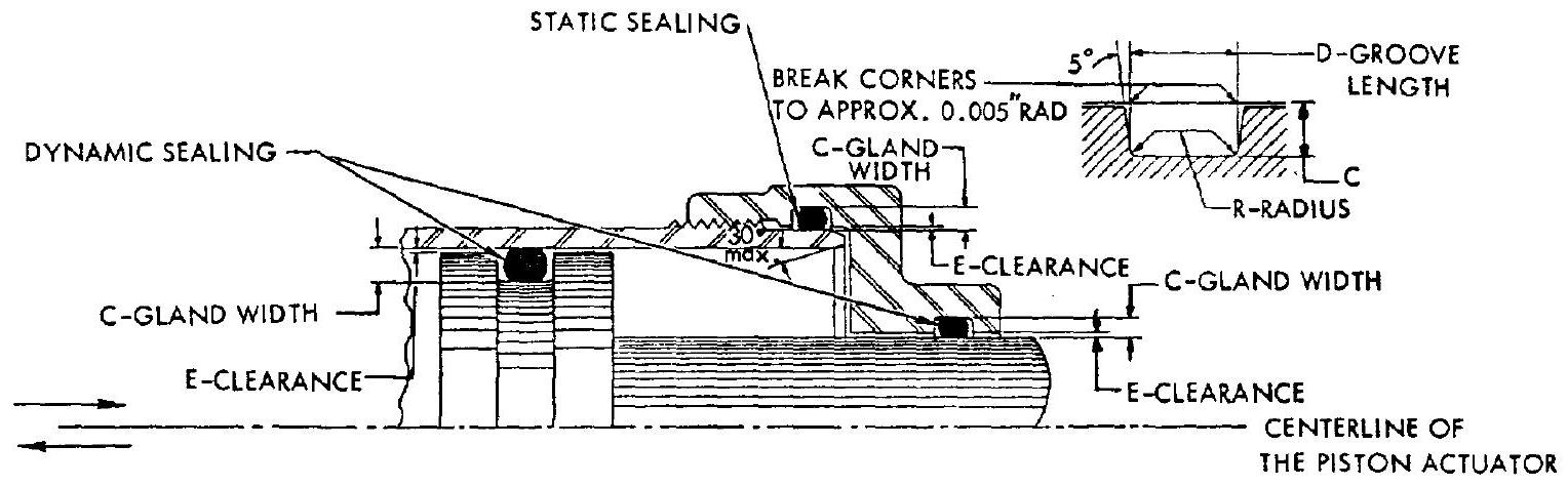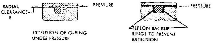 - Design correlations between fluid pressure, O-ring compound hardness and diametral clearance.-A frequent cause of seal failure is the extrusion of diametral-squeeze-type O-rings into the clearance gap adjacent to the O-ring groove (when under pressure) (fig. 7-25), leaving a permanent deformation after the pressure is reduced. Fluid pressure influences O-ring seal design because it affects the choice of compound hardness. The combination of fluid pressure and chosen hardness will determine the maximum clearance that can be tolerated safely. A proper combination of clearance and O-ring hardness may prevent O -ring extrusion (table ). In general, the O-ring nominal section diameter is chosen as large as space and installation considerations will permit. Past designs usually will provide a useful guide. In addition, Teflon backup rings as shown in figure are recommended for dynamic O-ring seals at sealing pressures over 800 psi and for static O-ring seals at pressures above 1500 psi .