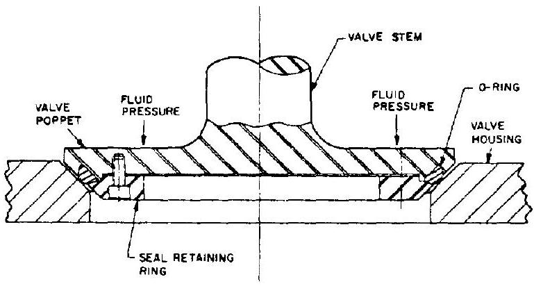 properties (furnished by the producer) is based on operating conditions such as type of fluid or propellant, pressure, temperature, and type of seal (dynamic or static). 5. Installation of diametral-squeeze-type O-ring seals.-Proper installation of O-rings during component assembly is extremely important to assure an effective seal. Generous chamfers or radii should be provided on all edges and corners in contact with O-rings to minimize the possibility of cutting or scratching during the assembly process. 6. O-ring seals for valve seats.-O-rings can be applied effectively as seals for valve seats (fig. 7-26). The resiliency of the O-ring absorbs shock loads and seals tightly at all pressures, even when some dirt and grit are present in the system. One design problem is to prevent the O-ring from being blown out of the groove. This can be prevented by providing a dovetail O-ring groove in a two-piece valve poppet (see fig. 7-26).