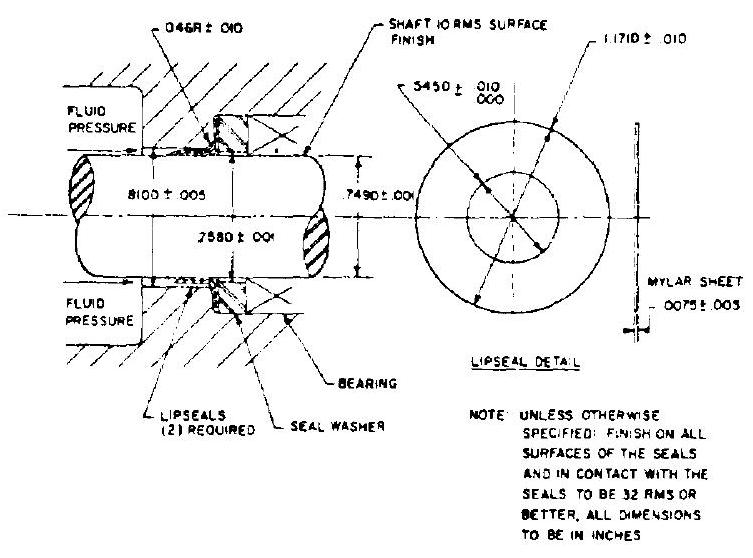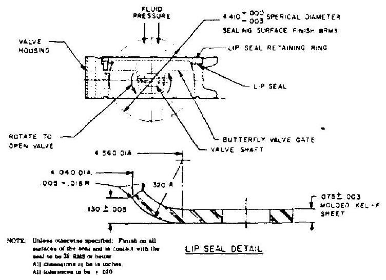 The basic design principle of lip seals is to employ the fluid pressure to increase the contact pressure at the sealing surfaces. Due to their lip configuration, the resilience of these seals is maintained even at very low temperatures. Design considerations for lip seals are similar to those for O-ring seals. The design approaches can best be illustrated by examples. Figure 7-27 shows a typical valve shaft rotating lip seal arrangement, including dimensions and surface finishes, for liquid oxygen and hydrogen service. Figure 7-28 presents the valve seat lip seal of a butterfly valve for use with the same riuids. Valve seat O-ring seals (fig. 7-26) made of Kel-F have also been successfully applied in poppettype valves for liquid oxygen. The design of lip seals for piston-type actuators using lowtemperature helium gas as the actuating fluid is shown in figure 7-29.