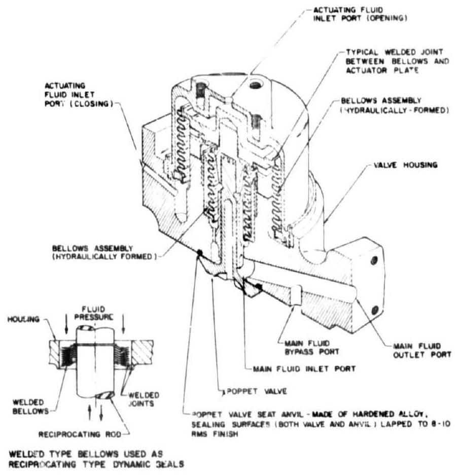 Figure 7-30.-Metallic bellows used as recipro-cating-type dynamic seals in a typical poppet valve for high- and low-temperature services.