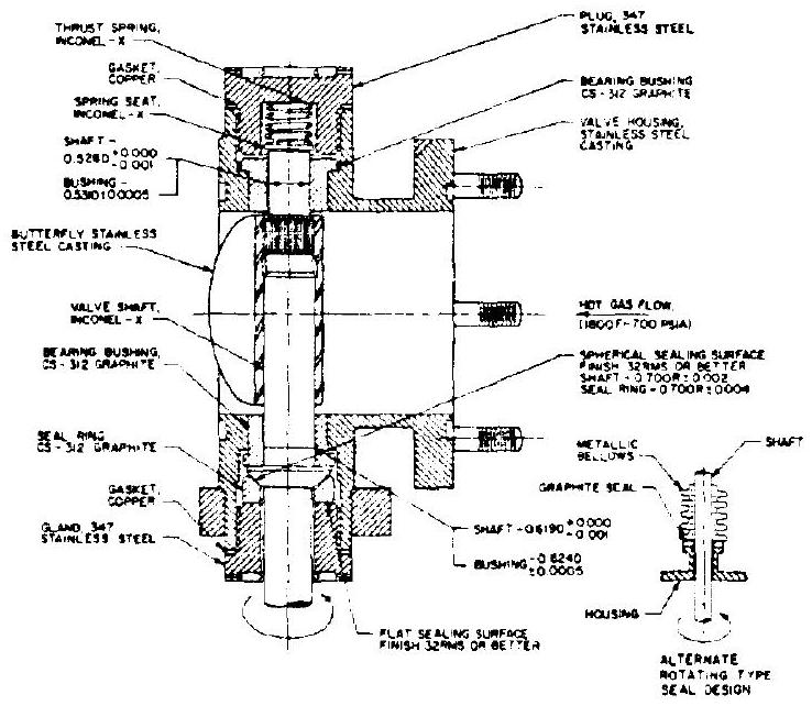 gas throttle valve which was operated successfully at temperatures ranging from to at pressures up to 700 psia . An alternate design is to attach a flat-face graphite seal ring to the end of a metallic bellows which is welded to the shaft (fig. 7-31). Here, the shaft misalinement is compensated by the flexibility of the bellows.