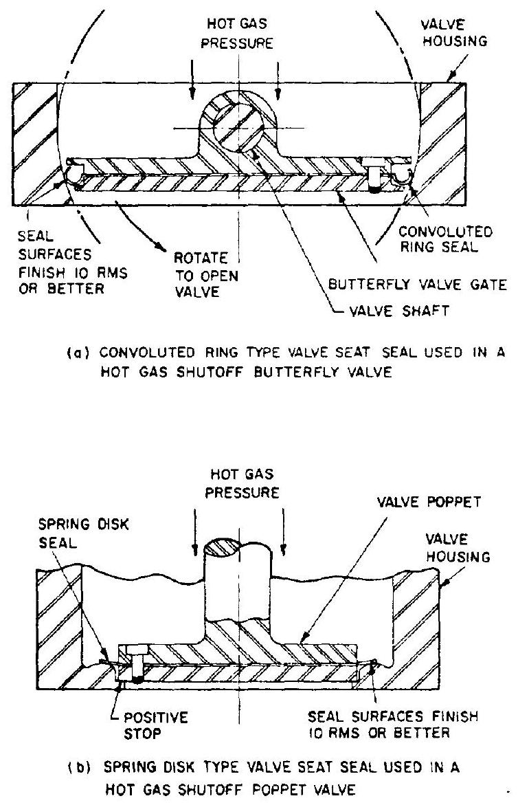 Figure 7-32(a) shows a convoluted-ring-type valve seat seal used in a hot gas shutoff butterfly valve. Depending upon the specific application, the convoluted ring may be made of hightemperature alloys such as Inconel-718. The rings effect a leakproof seal in the closed position, since the upstream fluid pressure tends to expand the convolute and produces a high contact unit force at the sealing surfaces. The curvature of the convolute ring tends to maintain a continuous contact with the valve seat. Figure 7-32(b) presents a metallic-spring-disk-type valve seat seal used in a hot gas shutoff poppet valve. Again, the upstream gas pressure produces a high contact unit load on the sealing surfaces. The valve seat has a curved contour which effects a continuous contact with the flat face of the seal disk.