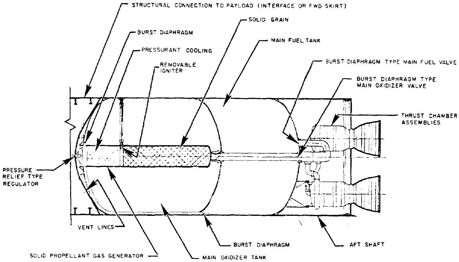 Figure 8-1 presents the configuration of a typical prepackaged storable liquid propulsion system. The tanks are arranged in tandem, with a common bulkhead between. This system is designed for long storage periods, perhaps 5 to 10 years. A main characteristic of these systems is that the propellants are factory loaded and are hermetically sealed in the tanks by burst diaphragms. Both tank and diaphragm construction materials must be compatible with the propellants for the storage duration. In the example, the propellants are expelled by pressurized gases produced by a solid propellant gas generator. The tank walls form an integral part of the vehicle structure and are designed to withstand the internal pressure loads as well as the vehicle dynamic loads. In some designs the tanks are further stabilized by the internal pressure against buckling; i.e., the walls are always kept under tension loads by a specified pressure level maintained during storage and handling. In smaller units, the walls are usually capable of taking external loads without being pressurized internally. Operational tank pressures for these range from 400 to 2000 psia .