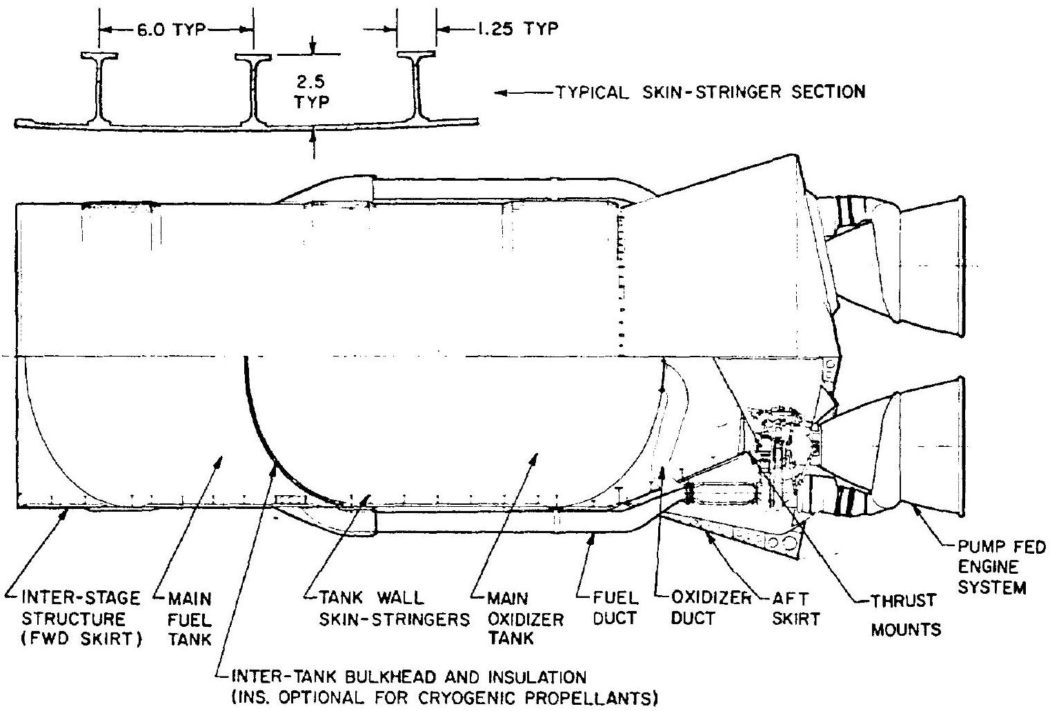 Figure S-2 presents the propellant tank design configuration of a typical propulsion system as used in the booster stages of a large launch vehicle such as the Saturn V. The system shown can be used for either storable or cryogenic propellants. The tanks are arranged in tandem; their walls form an integral part of the vehicle structure. For booster application, overall vehicle systems optimization usually dictates use of a turbopump-fed engine system. This permits relatively low operational tank pressures, ranging from 30 to 100 psia .