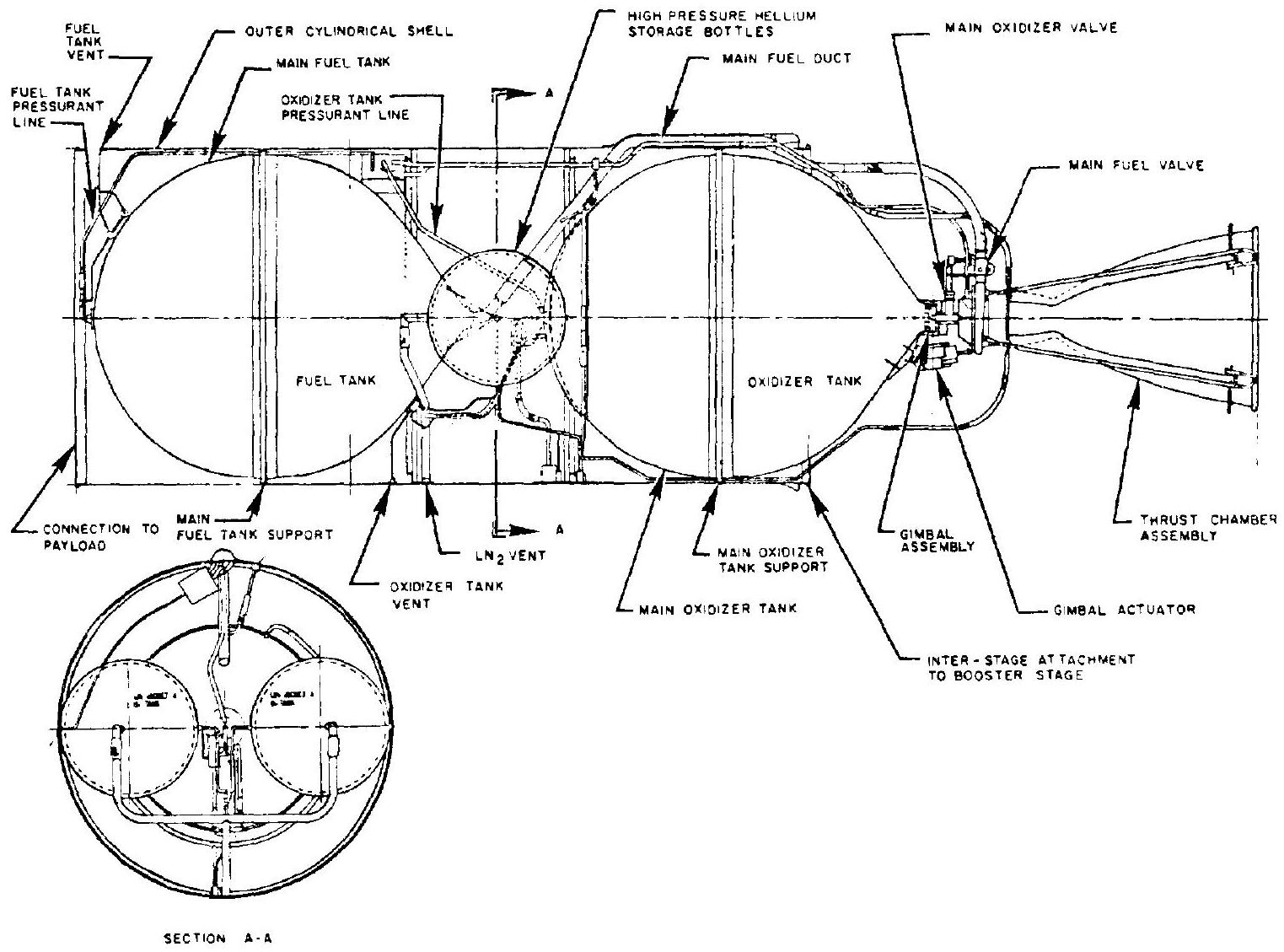 Figure 8-3 presents the propellant tank design configuration of a typical pressure-fed, upper stage propulsion system. Here, the tanks are contained within an outer cylindrical shell, through which thrust is transmitted to the payload. The shell is designed to withstand all anticipated boost and flight loads. The propellant tankage consists of two individual units. The main fuel tank is located forward, and the main oxidizer tank near the aft end. The two welded aluminum-alloy tanks are modified spheres, faired into conical sections at the bottom, for propellant discharge. The tanks are bolted to the shell structure around their support ring. The thrust chamber assembly is located just below, and closely coupled to, the oxidizer tank. Thrust is transmitted to the outer shell through the aft half of the oxidizer tank. Both tanks may be insulated independently, for cryogenic propellant service.