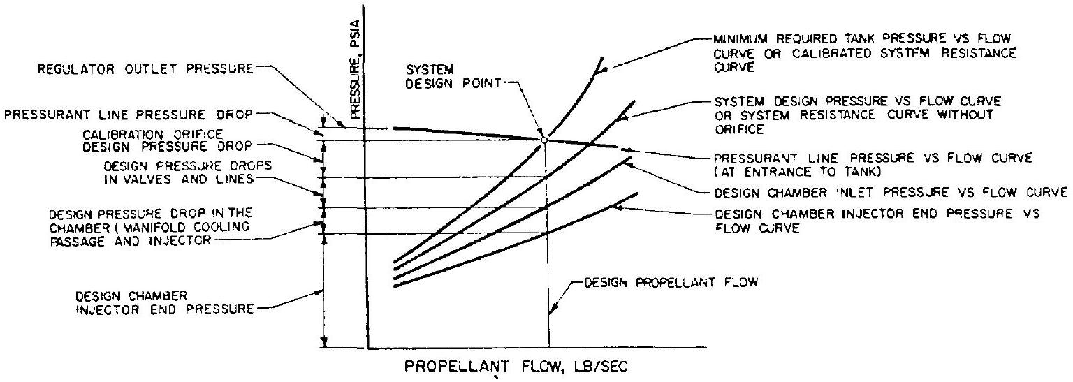 The design pressure versus flow curve of either propellant flow system can be obtained by the summation of design chamber pressure versus flow and component design pressure drop characteristics, as shown in figure 10-5. In addition, an orifice is introduced in each propellant flow system for calibration. The minimum required tank pressure versus flow curve for each propellant is thus derived. In most pressure feed systems, the design orifice pressure drop for systems calibration determines the maximum allowable cumulative pressure drop increase of the components above their nominal values. A suitable tank pressurization system can then be designed, compatible with minimum required tank pressure versus flow characteristics.
