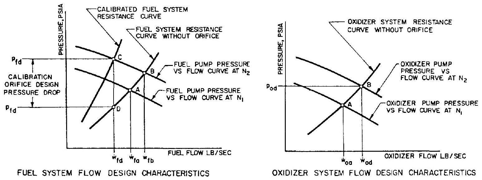 of its flow characteristics from its design value will be kept within a reasonable limit, in order to facilitate systems calibration, and to keep other system components in their design operating region. (3) Sufficient pressure head should be set aside in each engine propellant feed system to compensate for contingencies due to component flow resistance deviations. The propellant feed system can then be calibrated by means of orifices or other adjusting means.